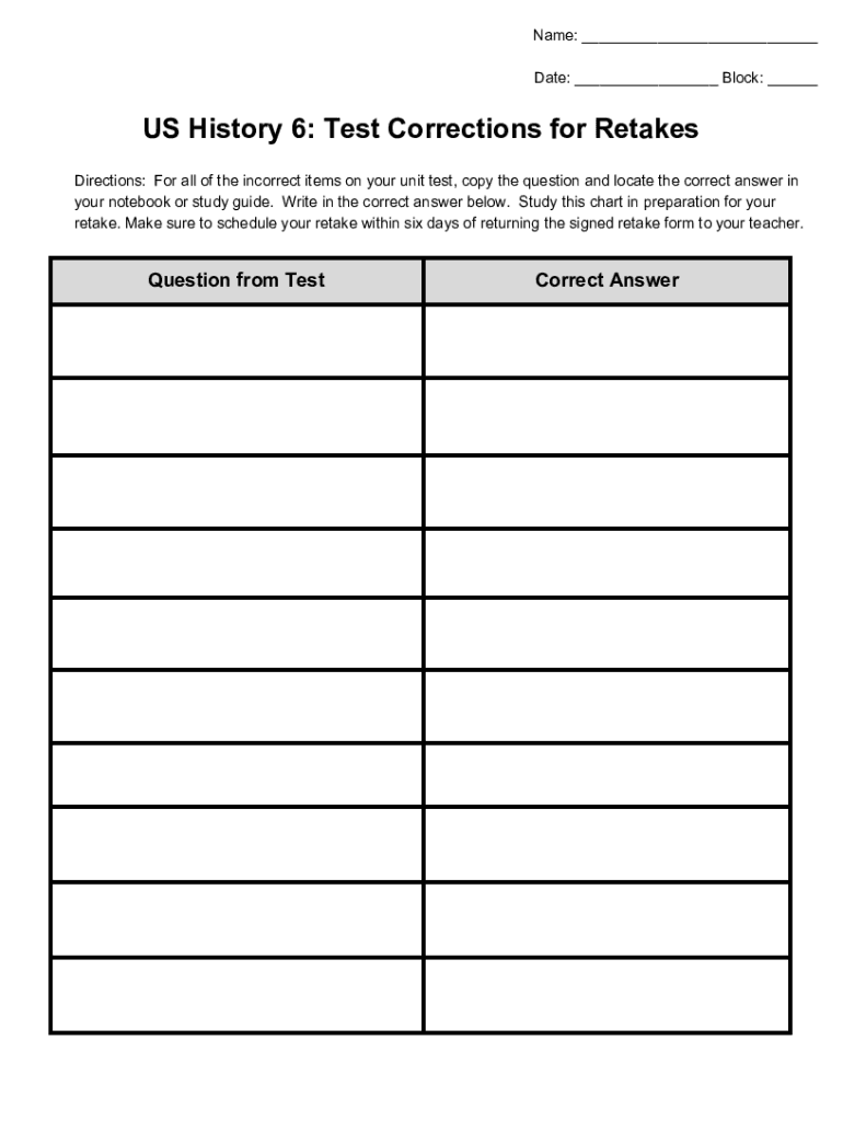 Get the free Test Corrections for Retakes
