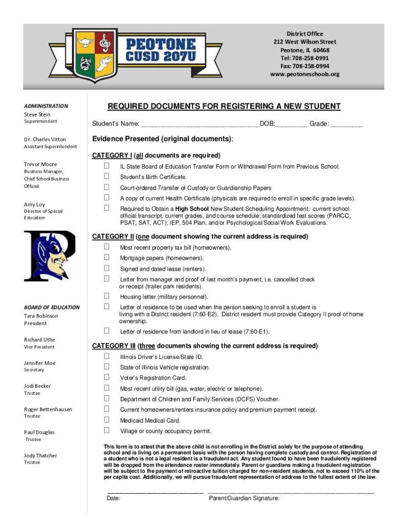District Office 212 West Wilson Street Photon, IL 60468 Tel: 7082580991 Fax: 7082580994 www.peotoneschools.orgADMINISTRATION Steve SteinREQUIRED DOCUMENTS FOR REGISTERING A NEW STUDENTSuperintendentStudentsAnd/or