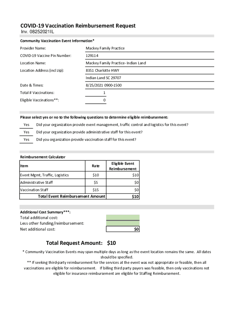 COVID-19 Vaccination Reimbursement Request In. 08252021IL Community Vaccination Event Information* Provider Name:Mickey Family PracticeCOVID19 Vaccine Pin:129114Location Name:Mickey Family Practice