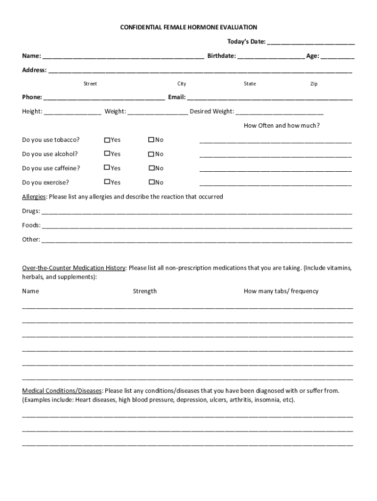 CONFIDENTIAL FEMALE HORMONE EVALUATION Today's Date: ___ Name: ___ Birthdate: ___ Age: ___ Address: ___ StreetCityStateZipPhone: ___ Email: ___ Height: ___ Weight: ___ Desired Weight: ___ How Often