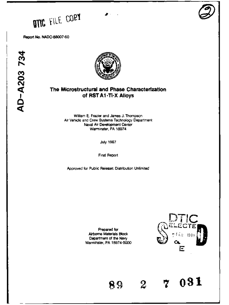 Report No. NADC8800760IThe Microstructural and Phase Characterization of RST Al Six Alloys William E. Frazier and James J. Thompson Air Vehicle and Crew Systems Technology Department Naval Air Development