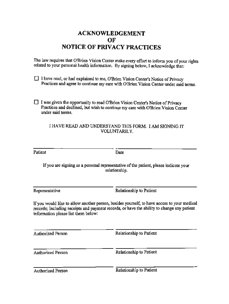 ACKNOWLEDGEMENT NOTICE OF PRIVACY Practices law requires that O\'Brien Vision Center makes every effort to inform you of your rights related to your personal health information. By signing below,