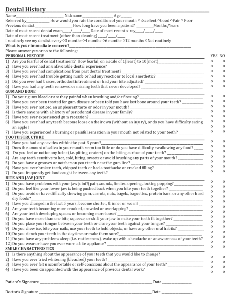 Dental History___ Name___ Nickname___ Age___ Referred by___ How would you rate the condition of your mouth Excellent Good Fair Poor Previous dentist ___ How long have you been a patient? ___Months/Years