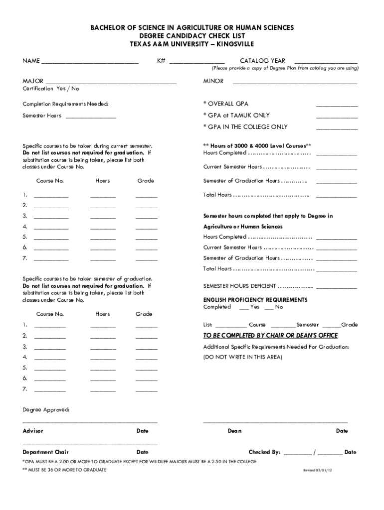 BACHELOR OF SCIENCE IN AGRICULTURE OR HUMAN SCIENCES DEGREE CANDIDACY CHECK LIST TEXAS A&M UNIVERSITY HINESVILLE NAME ___K# ___CATALOG YEAR___(Please provide a copy of Degree Plan from catalog you