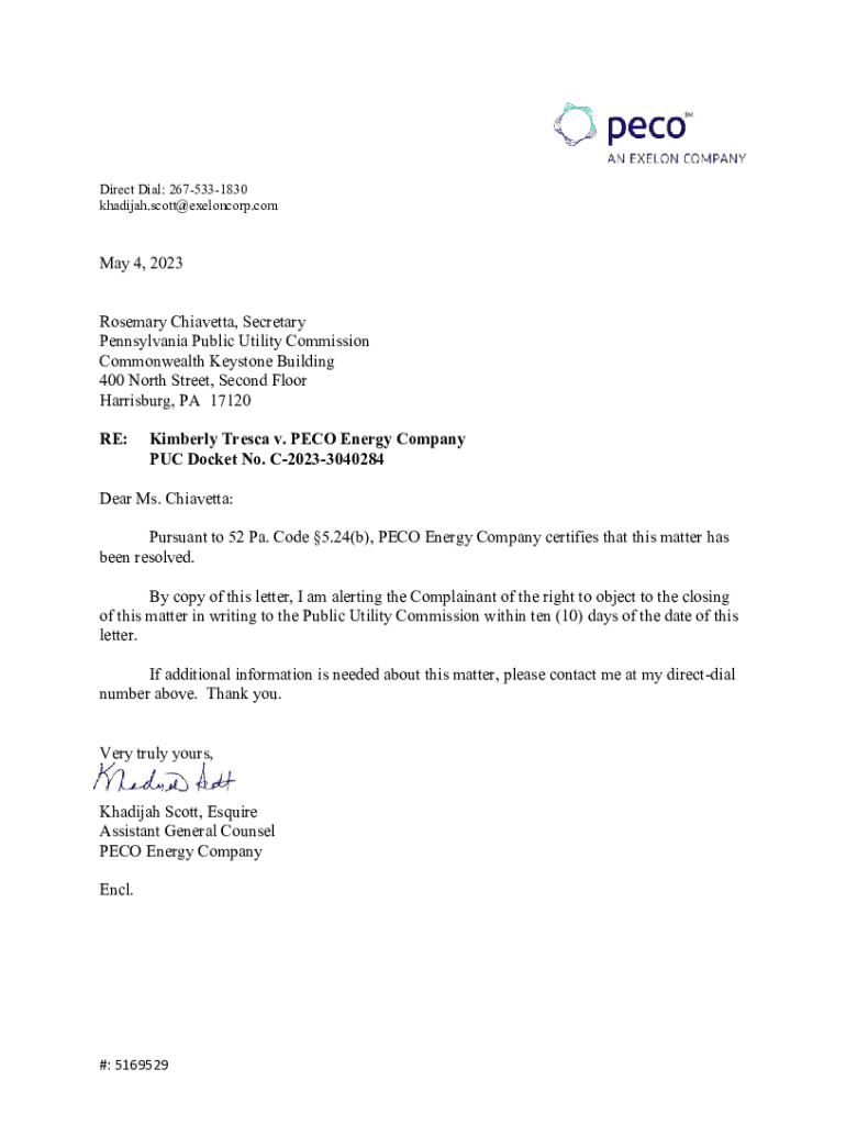 Direct Dial: 2675331830 khadijah.scott@exeloncorp.comMay 4, 2023 Rosemary Ciabatta, Secretary Pennsylvania Public Utility Commission Commonwealth Keystone Building 400 North Street, Second Floor Harrisburg,