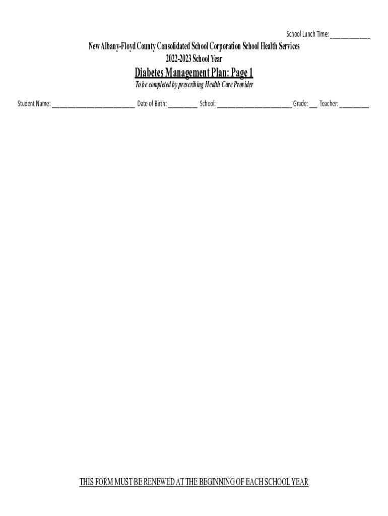 School Lunch Time: ___New Albany Floyd County Consolidated School Corporation School Health Services 20222023 School Prediabetes Management Plan: Page 1 To be completed by prescribing Health Care