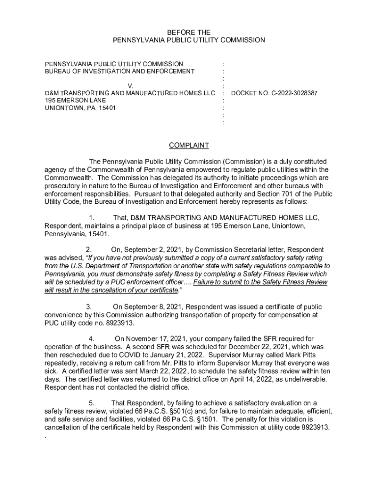 BEFORE THE PENNSYLVANIA PUBLIC UTILITY COMMISSION PENNSYLVANIA PUBLIC UTILITY COMMISSION BUREAU OF INVESTIGATION AND ENFORCEMENT V. D&M TRANSPORTING AND MANUFACTURED HOMES LLC 195 EMERSON LANE UNIONTOWN,