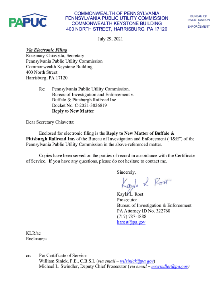 COMMONWEALTH OF PENNSYLVANIA PUBLIC UTILITY COMMISSION COMMONWEALTH KEYSTONE BUILDING 400 NORTH STREET, HARRISBURG, PA 17120BUREAU OF INVESTIGATION & ENFORCEMENT July 29, 2021, Via Electronic Filing