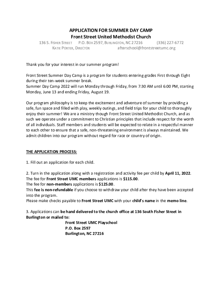 Get the free APPLICATION FOR SUMMER DAY CAMP Front Street ...