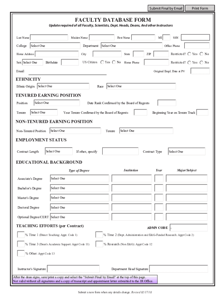 Submit Final by Emailing FormFACULTY DATABASE Formulate required of all Faculty, Scientists, Dept. Heads, Deans, And other Instructors