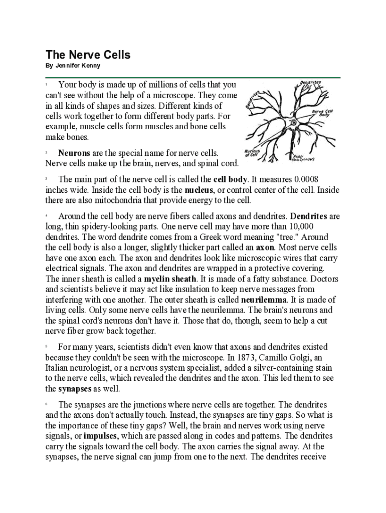 The Nerve Cells By Jennifer KennyYour body is made up of millions of cells that you can\'t see without the help of a microscope. They come in all kinds of shapes and sizes. Different kinds of cells