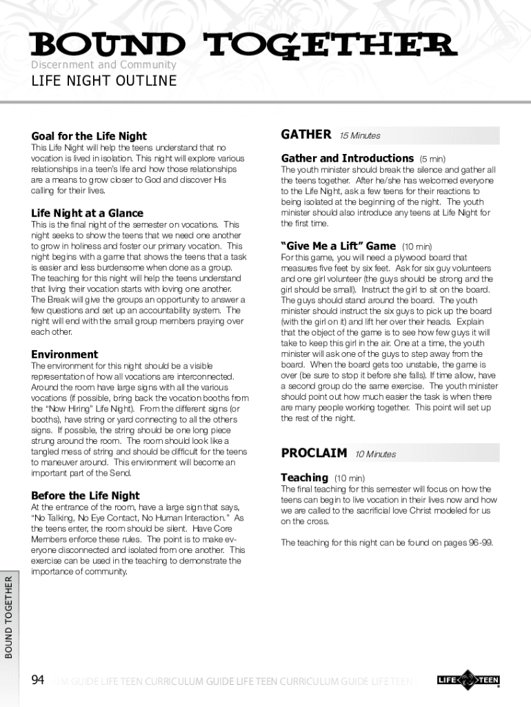 Bound Together Discernment and CommunityLIFE NIGHT OUTLINEGoal for the Life Nights Life Night will help the teens understand that no vocation is lived in isolation. This night will explore various