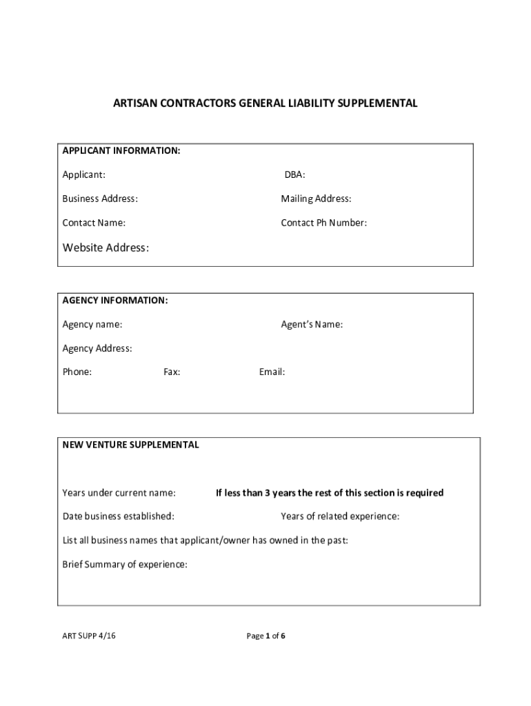 To fill out the artisan contractors supplemental application, the contractor must provide detailed information about their specific trade, services, and any additional risks associated with their work.