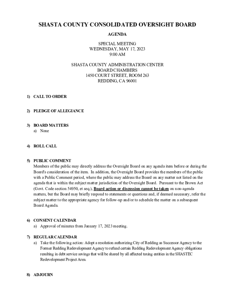 SHASTA COUNTY CONSOLIDATED OVERSIGHT BOARD AGENDA SPECIAL MEETING WEDNESDAY, MAY 17, 2023 9:00 AM SHASTA COUNTY ADMINISTRATION CENTER BOARD CHAMBERS 1450 COURT STREET, ROOM 263 REDDING, CA 96001 1)