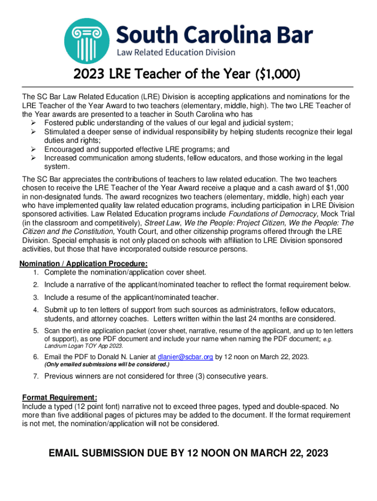 2023 ARE Teacher of the Year ($1,000) The SC Bar Law Related Education (ARE) Division is accepting applications and nominations for they ARE Teacher of the Year Award to two teachers (elementary,