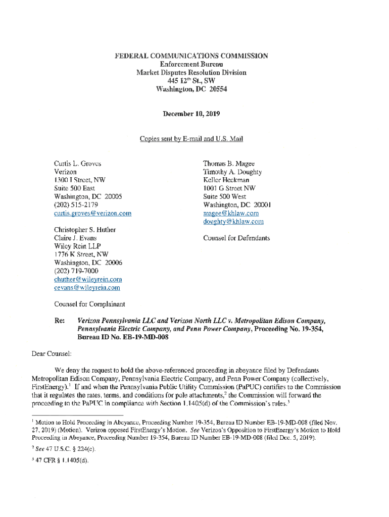 FEDERAL COMMUNICATIONS COMMISSION Enforcement Bureau Market Disputes Resolution Division 445 l2 SW Washington, DC 20554December 10, 2019Copies sent by Email and U.S. Mail Curtis L. Groves Verizon