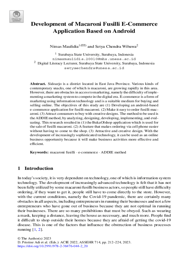 Development of Macaroni Fusible e-commerce Application Based on Android Ni mas Maulidia1(B) and Set ya Chandra Wibawa2 1 Surabaya State University, Surabaya, Indonesianimasmaulidia.20010@mhs.unesa.ac.id2