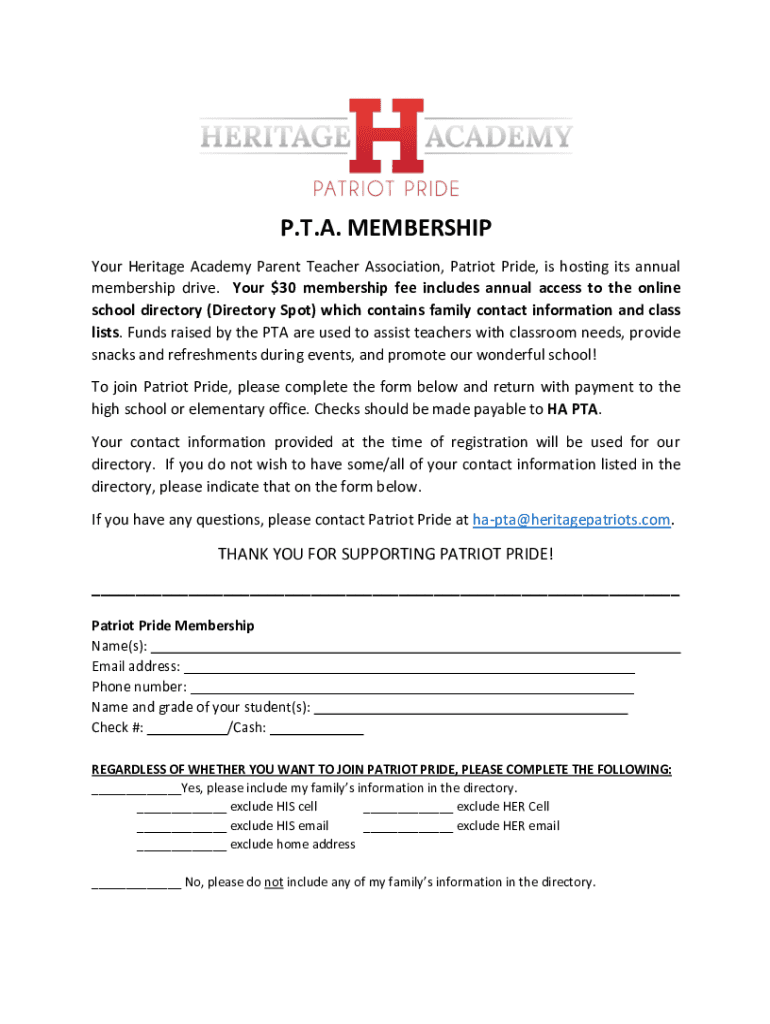 P.T.A. MEMBERSHIP Your Heritage Academy Parent Teacher Association, Patriot Pride, is hosting its annual membership drive. Your $30 membership fee includes annual access to the online school directory