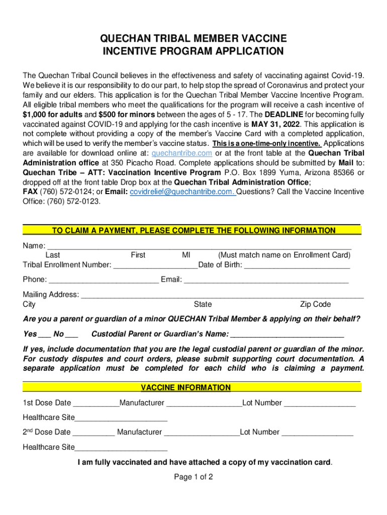 Get the free Quechan Tribal members vaccination incentive program
