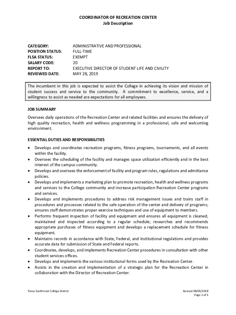 COORDINATOR OF RECREATION CENTER Job DescriptionCATEGORY: POSITION STATUS: FLEA STATUS: SALARY CODE: REPORT TO: REVIEWED DATE:ADMINISTRATIVE AND PROFESSIONAL FULL TIME EXEMPT 20 EXECUTIVE DIRECTOR