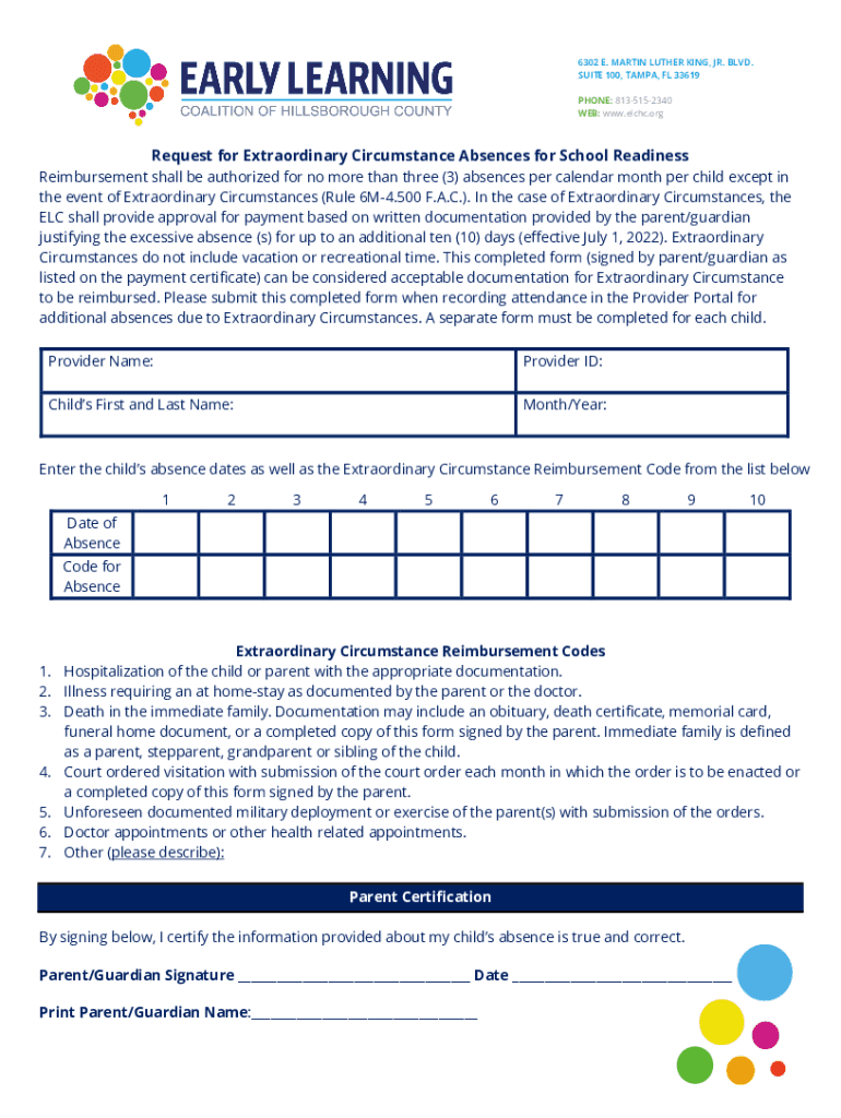 6302 E. MARTIN LUTHER KING, JR. BLVD. SUITE 100, TAMPA, FL 33619 PHONE: 8135152340 WEB: www.elchc.orgRequest for Extraordinary Circumstance Absences for School Readiness Reimbursement shall be authorized