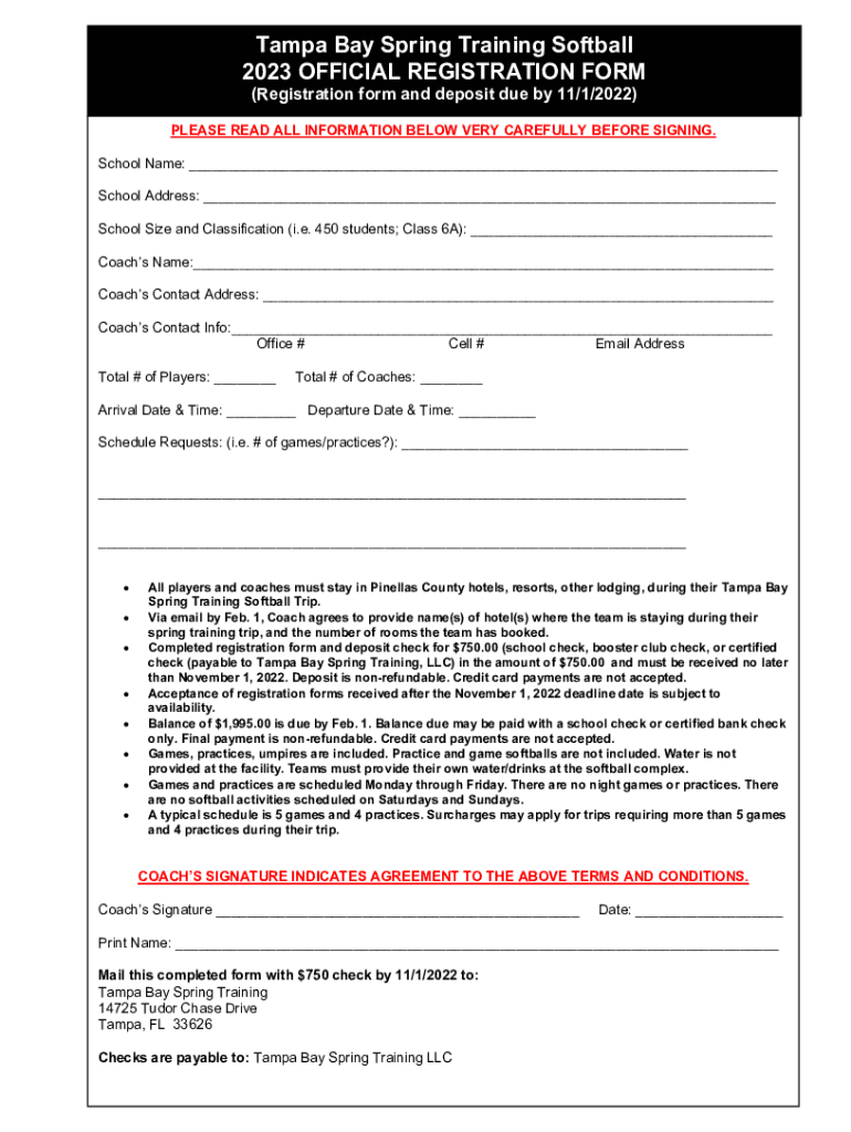 Tampa Bay Spring Training Softball 2023 OFFICIAL REGISTRATION FORM (Registration form and deposit due by 11/1/2022)PLEASE READ ALL INFORMATION BELOW VERY CAREFULLY BEFORE SIGNING. School Name: ___