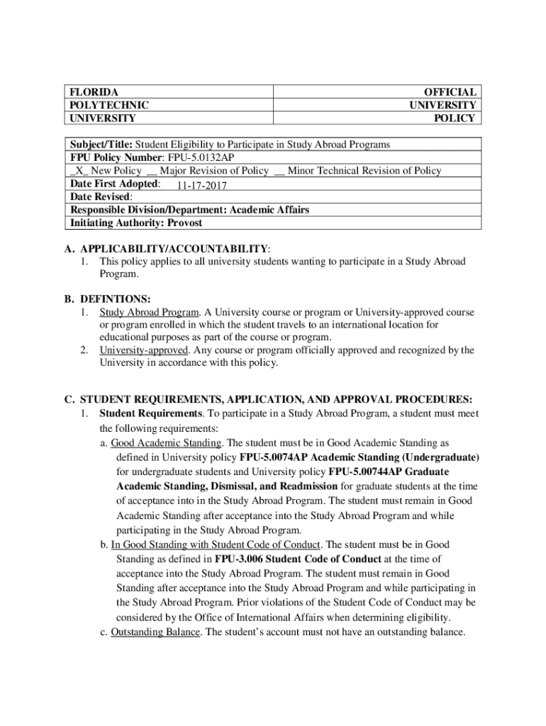 FLORIDA POLYTECHNIC UNIVERSITYOFFICIAL UNIVERSITY POLICYSubject/Title: Student Eligibility to Participate in Study Abroad Programs FPU Policy Number: FPU5.0132AP _X_ New Policy __ Major Revision of