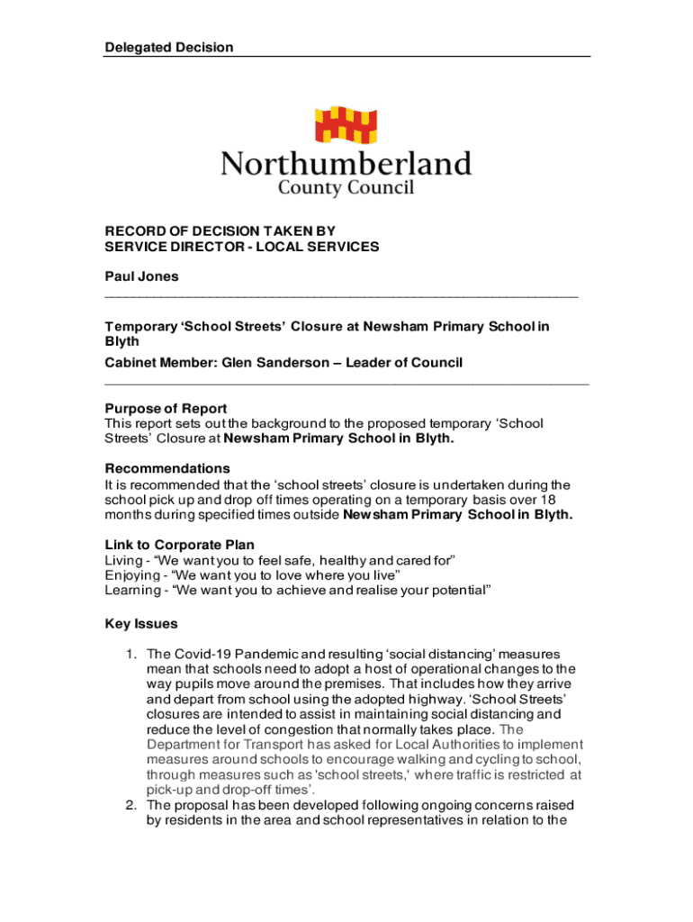 Delegated DecisionRECORD OF DECISION TAKEN BY SERVICE DIRECTOR LOCAL SERVICES Paul Jones ___Temporary School Streets Closure at New sham Primary School in Blythe Cabinet Member: Glen Sanderson Leader