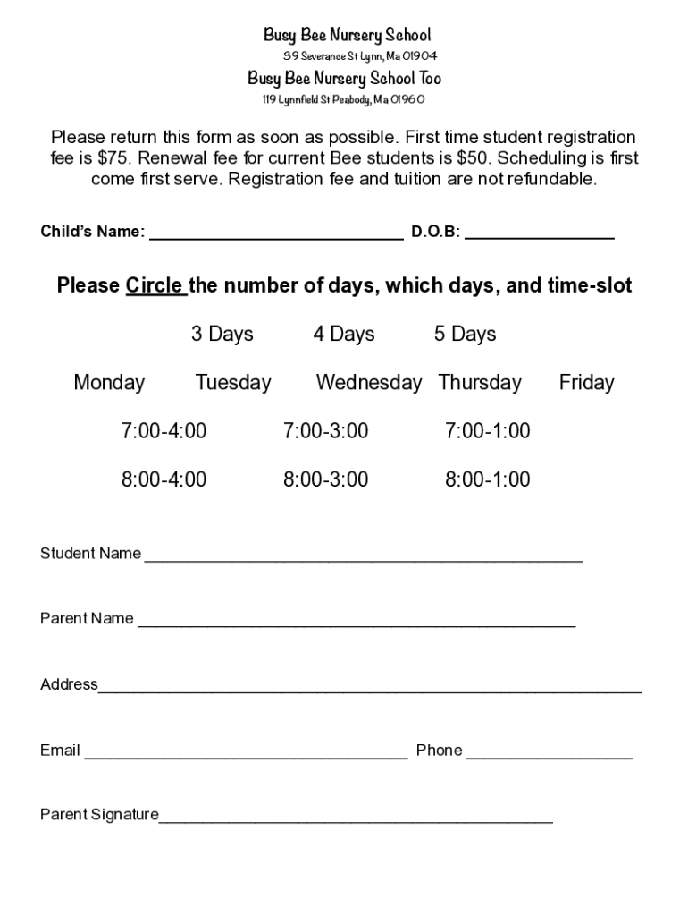 39 Severance St Lynn, Ma 01904Busy Bee Nursery School To 119 Lynn field St Peabody, Ma 01960Please return this form as soon as possible. First time student registration fee is $75. Renewal fee for