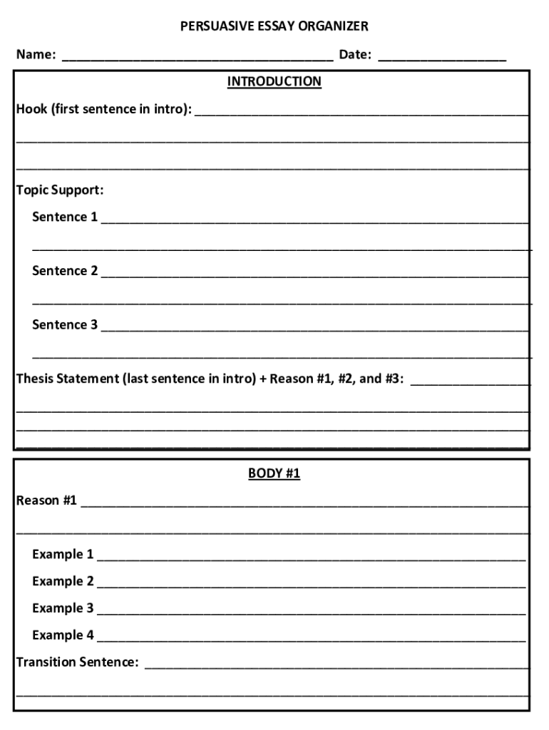 PERSUASIVE ESSAY ORGANIZER Name: ___ Date: ___ INTRODUCTION Hook (first sentence in intro): ___ ___ ___ Topic Support: Sentence 1 ___ ___ Sentence 2 ___ ___ Sentence 3 ___ ___ Thesis Statement (last