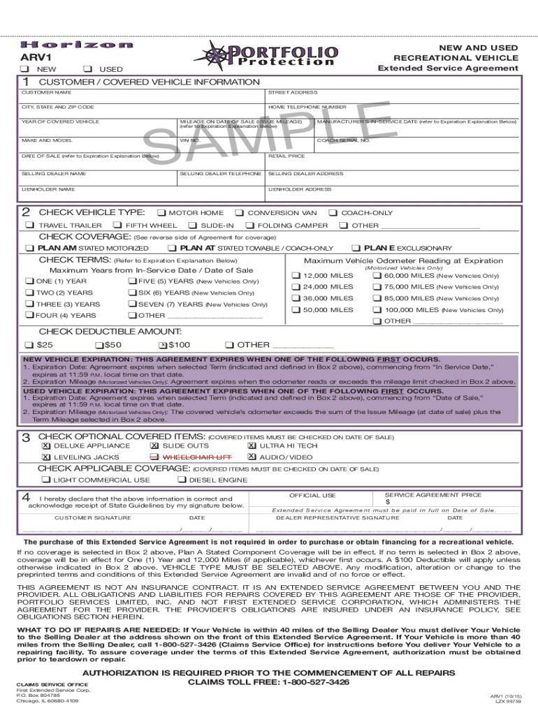 ARV1 NEW1NEW AND USED RECREATIONAL VEHICLE Extended Service AgreementUSEDCUSTOMER / COVERED VEHICLE INFORMATIONCUSTOMER BACKSTREET ADDRESS L P SimCity. STATE AND ZIP WODEHOUSE TELEPHONE NUMBERED OF