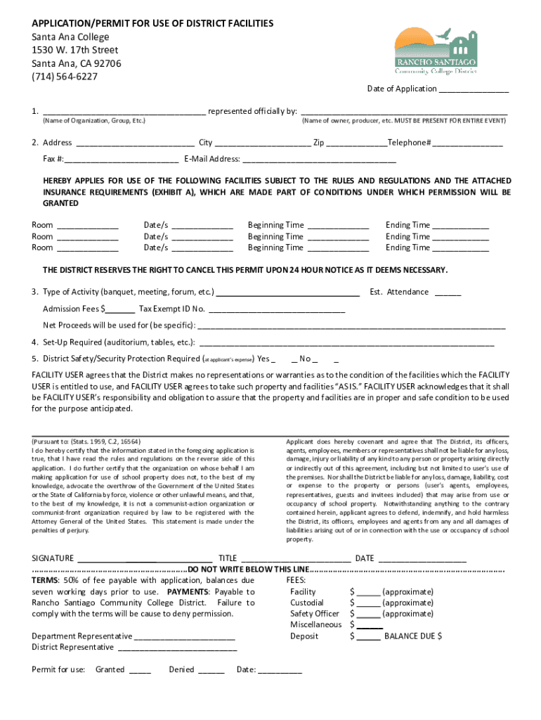 APPLICATION/PERMIT FOR USE OF DISTRICT FACILITIES Santa Ana College PRINT 1530 W. 17th Street Santa Ana, CA 92706 (714) 5646227Clear Format of Application ___1. ___ represented officially by: ___