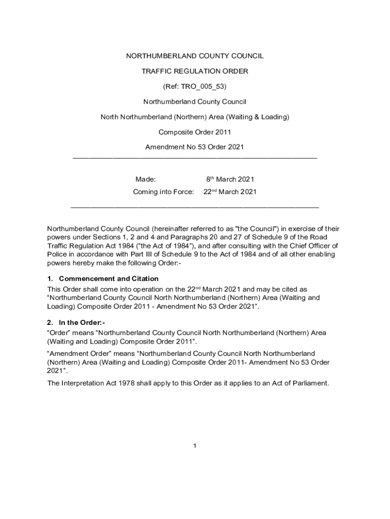 Get the free Northumberland County Council Traffic Regulation Order