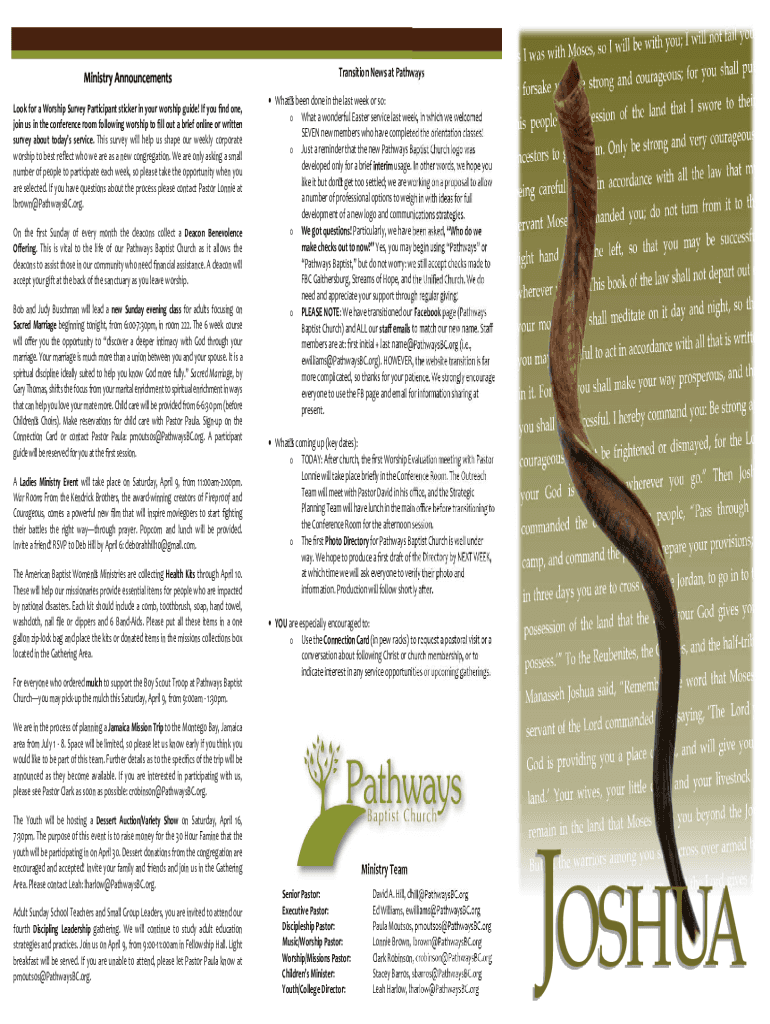 Transition News at Pathways Look for a Worship Survey Participant sticker in your worship guide! If you ND one, join us in the conference room following worship to ll out a brief online or written