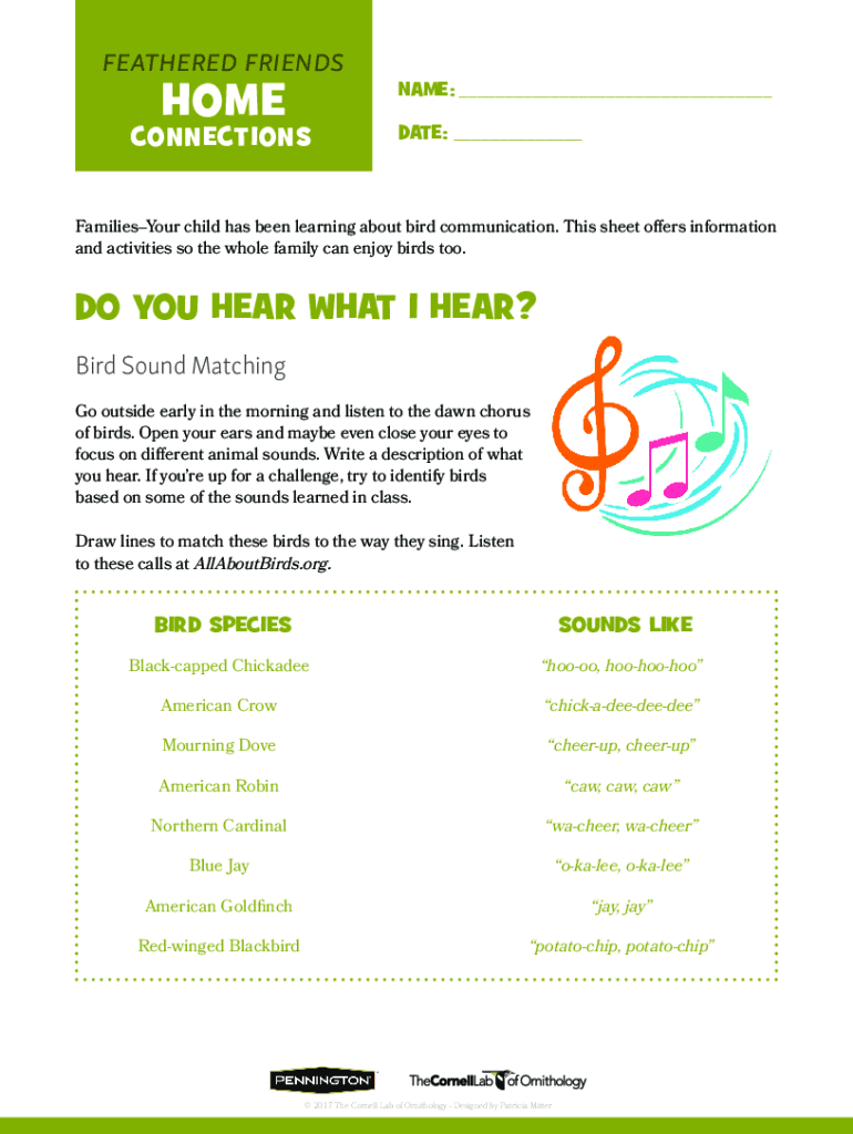Feathered friendsHOMEconnectionsNAME: ___ DATE: ___FamiliesYour child has been learning about bird communication. This sheet offers information and activities, so the whole family can enjoy birds