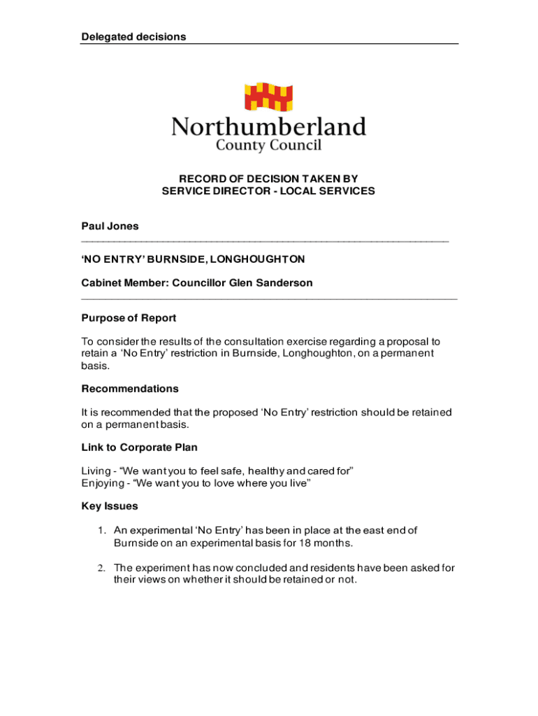 Delegated decisionsRECORD OF DECISION TAKEN BY SERVICE DIRECTOR LOCAL SERVICES Paul Jones ___NO ENTRY BURNSIDE, LONGHOUGHTON Cabinet Member: Councillor Glen Sanderson ___ Purpose of Report To consider