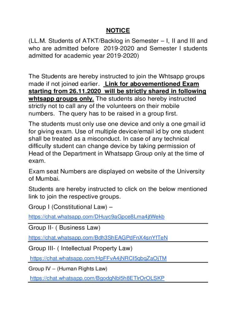 NOTICE (LL.M. Students of AKT/Backlog in Semester I, II and III and who are admitted before 20192020 and Semester I students admitted for academic year 20192020)The Students are hereby instructed