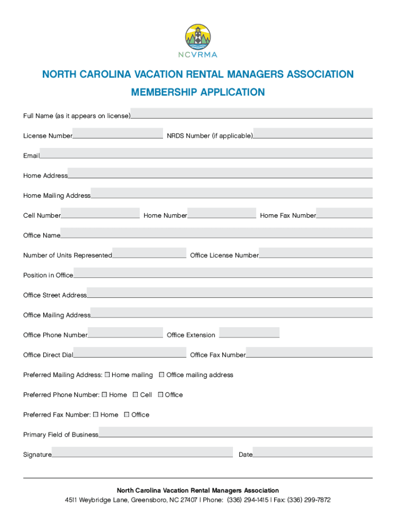 NORTH CAROLINA VACATION RENTAL MANAGERS ASSOCIATION MEMBERSHIP APPLICATION Full Name (as it appears on license) License Numbers Number (if applicable) Email Home Address Home Mailing Address Cell