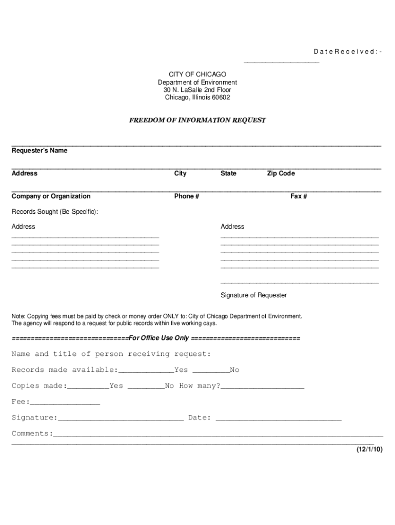 DateReceived:___ CITY OF CHICAGO Department of Environment 30 N. Basally 2nd Floor Chicago, Illinois 60602___ Requester\'s Name ___ Address City State Zip Code ___ Company or Organization Phone #