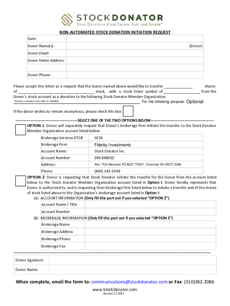 AUTOMATED STOCK DONATION INITIATION REQUEST Date: Donor Name(s):(Donor)Donor Email: Donor Home Address: Donor Phone: Please accept this letter as a request that the Donor named above would like to