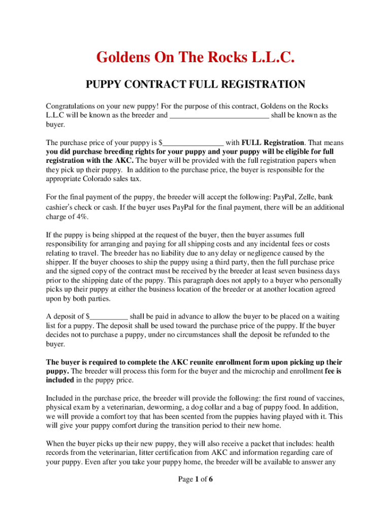 Golden's On The Rocks L.L.C. PUPPY CONTRACT FULL REGISTRATION Congratulations on your new puppy! For the purpose of this contract, Golden son the Rocks L.L.C will be known as the breeder and ___ shall