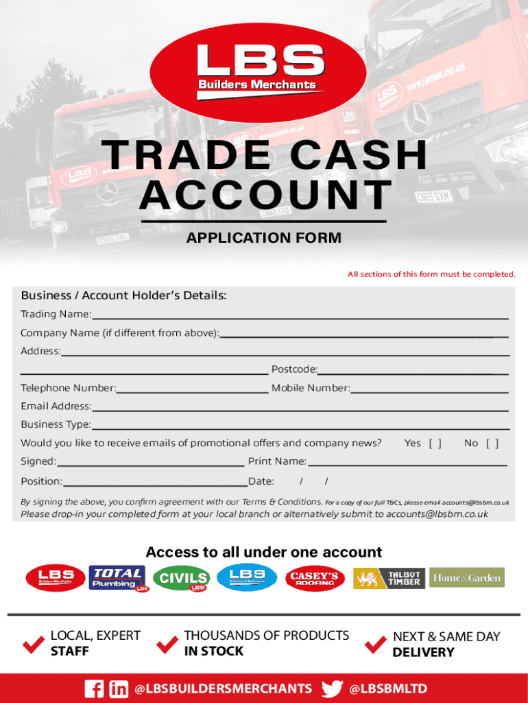 LBS Builders MerchantsTRADE CASH ACCOUNT APPLICATION FORM All sections of this form must be completed. Business / Account Holders Details: Trading Name:___ Company Name (if different from above):