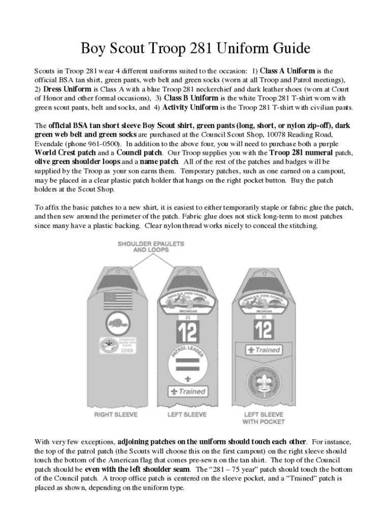 Boy Scout Troop 281 Uniform Guide Scouts in Troop 281 wear 4 different uniforms suited to the occasion: 1) Class A Uniform is the official BSA tan shirt, green pants, web belt and green socks (worn