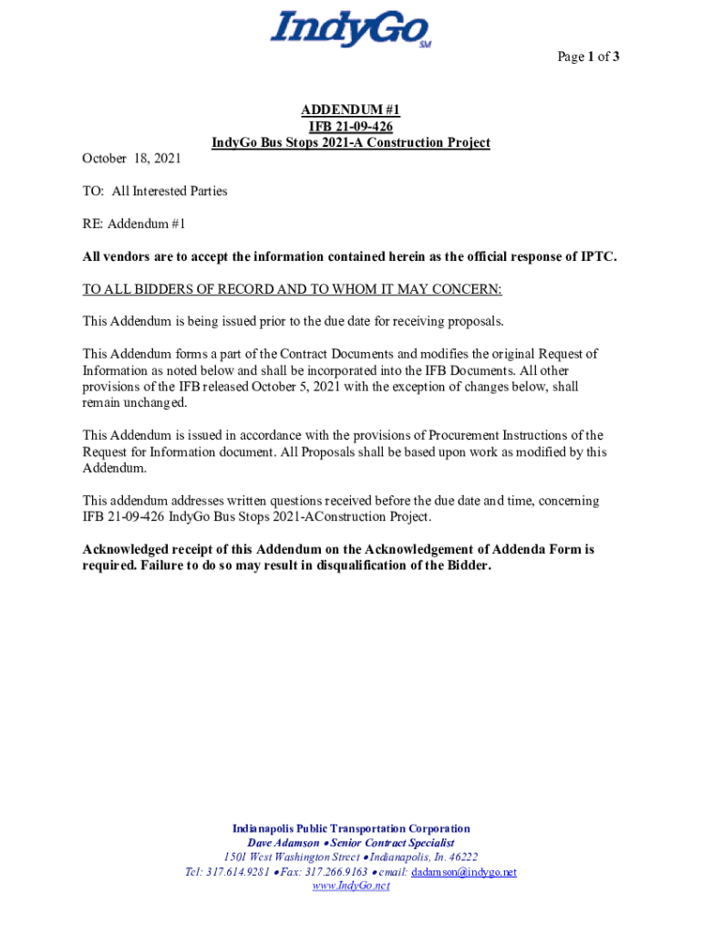 Page 1 of 3 ADDENDUM #1 IF 2109426 Indigo Bus Stops 2021A Construction Project October 18, 2021TO: All Interested Parties RE: Addendum #1 All vendors are to accept the information contained herein