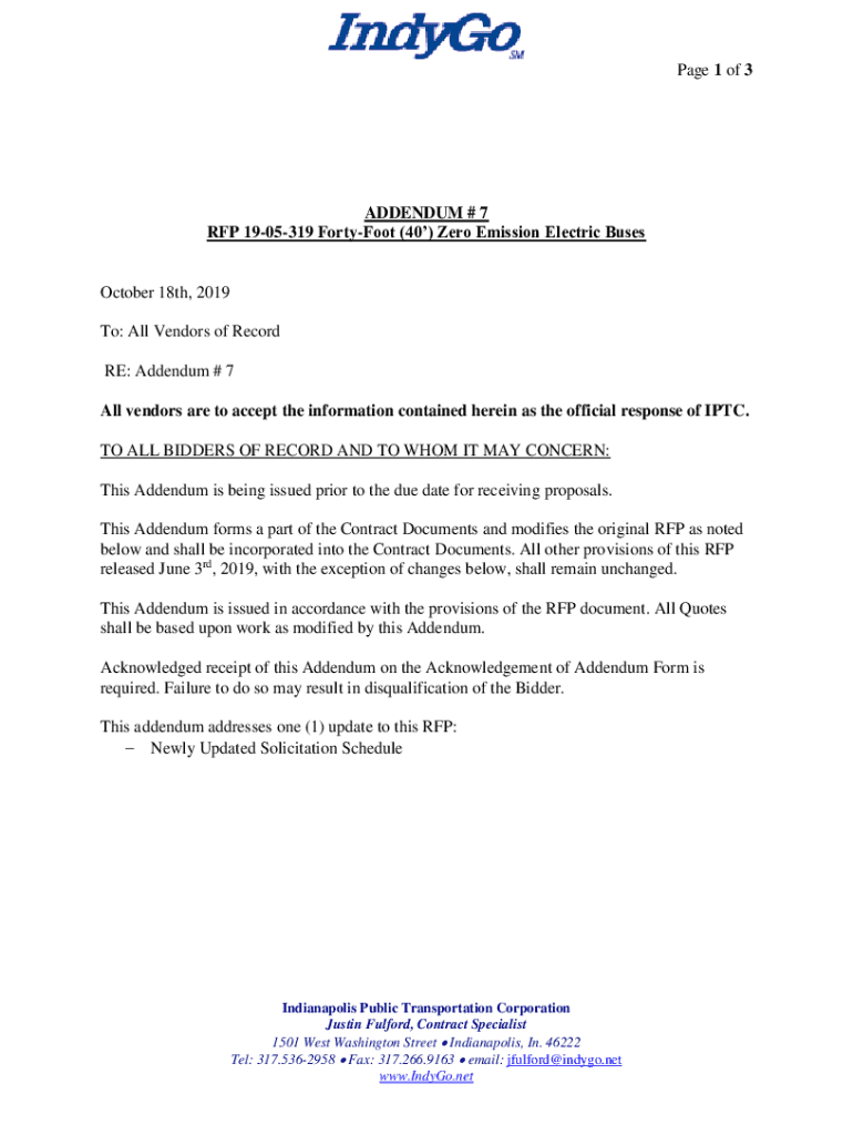 Page 1 of 3ADDENDUM # 7 RFP 1905319 Forefoot (40) Zero Emission Electric Buses October 18th, 2019 To: All Vendors of Record RE: Addendum # 7 All vendors are to accept the information contained herein