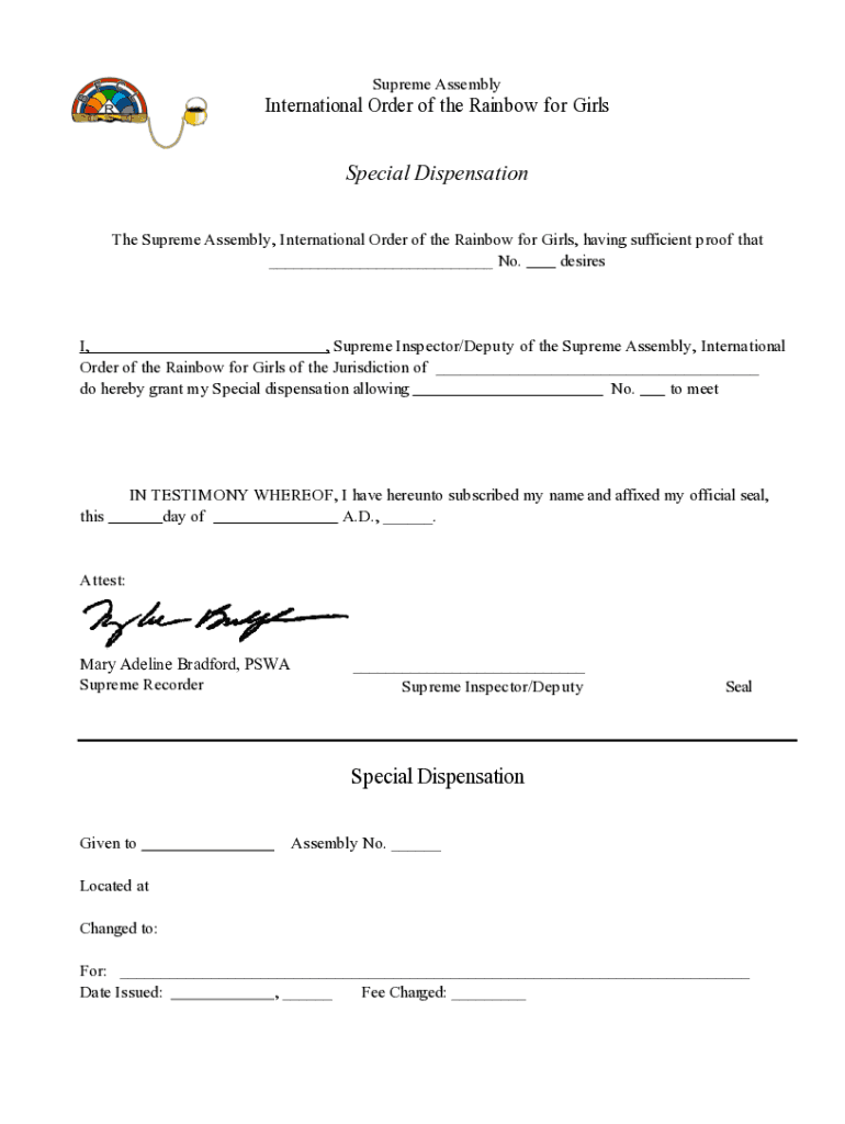 Supreme AssemblyInternational Order of the Rainbow for GirlsSpecial Dispensation The Supreme Assembly, International Order of the Rainbow for Girls, having sufficient proof that ___ No. desires, Supreme