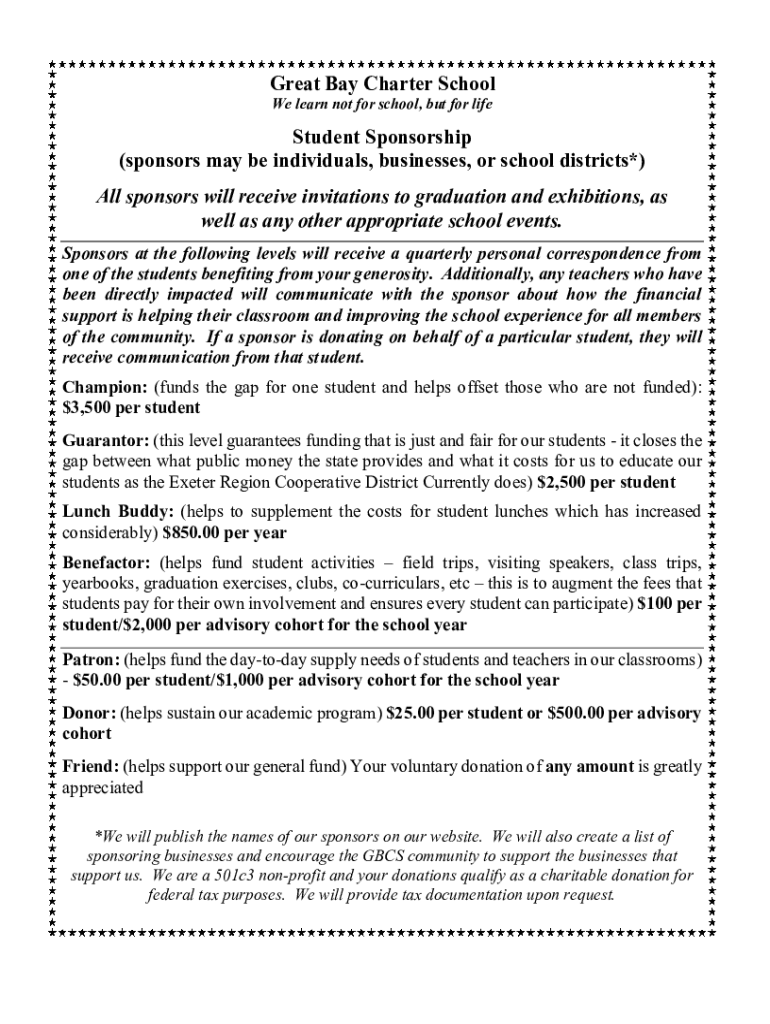 Great Bay Charter School We learn not for school, but for lifeStudent Sponsorship (sponsors may be individuals, businesses, or school districts*) All sponsors will receive invitations to graduation