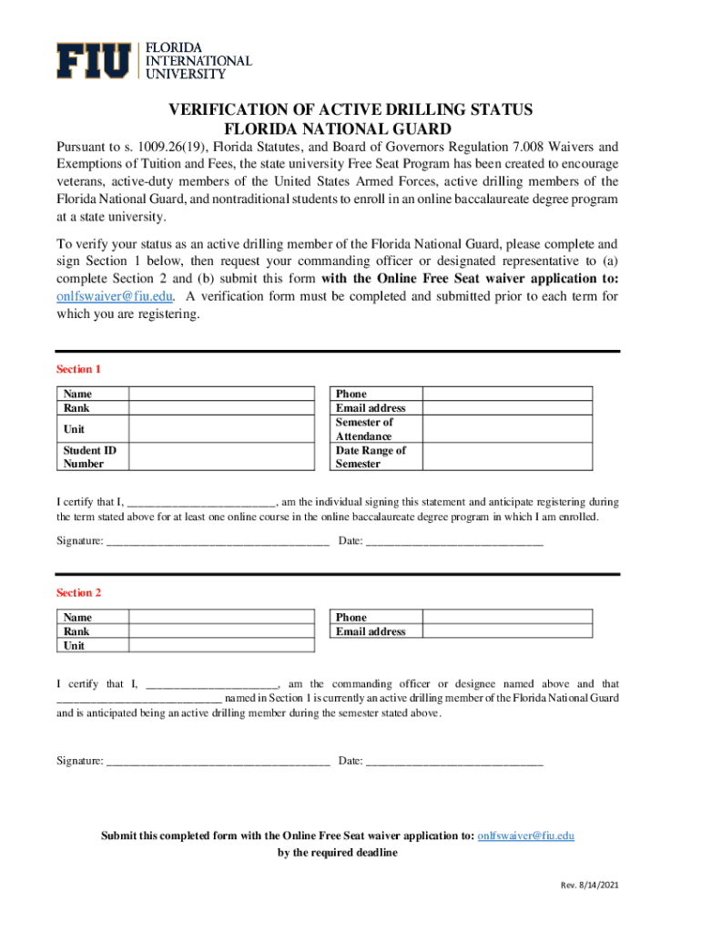 VERIFICATION OF ACTIVE DRILLING STATUS FLORIDA NATIONAL GUARD Pursuant to s. 1009.26(19), Florida Statutes, and Board of Governors Regulation 7.008 Waivers and Exemptions of Tuition and Fees, the