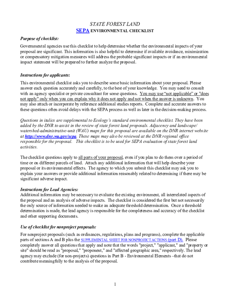 STATE FOREST LAND SEPA ENVIRONMENTAL CHECKLIST Purpose of checklist: Governmental agencies use this checklist to help determine whether the environmental impacts of your proposal are significant.