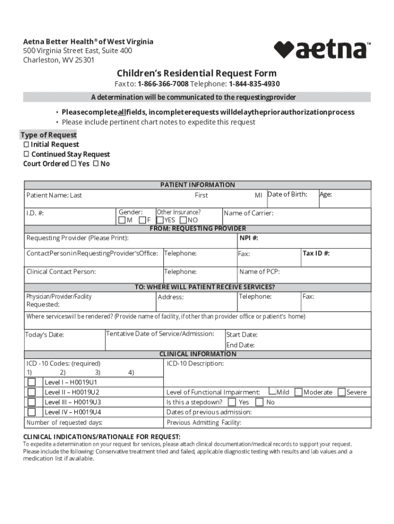 Aetna Better Health of West Virginia 500 Virginia Street East, Suite 400 Charleston, WV 25301Childrens Residential Request Format to: 18663667008 Telephone: 18448354930A determination will be communicated